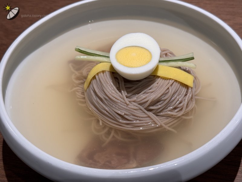 입구에 들어서자마자 깔끔하고 단정한 분위기가 인상적이었다. 자리에 앉자 기본적으로 제공되는 메밀차가 나왔는데, 전통 평양냉면집들이 보통 면수를 제공하는 것과는 차별화된 느낌이었다. 메밀차의 고소한 향이 미각을 부드럽게 열어주며 기대감을 높였다.